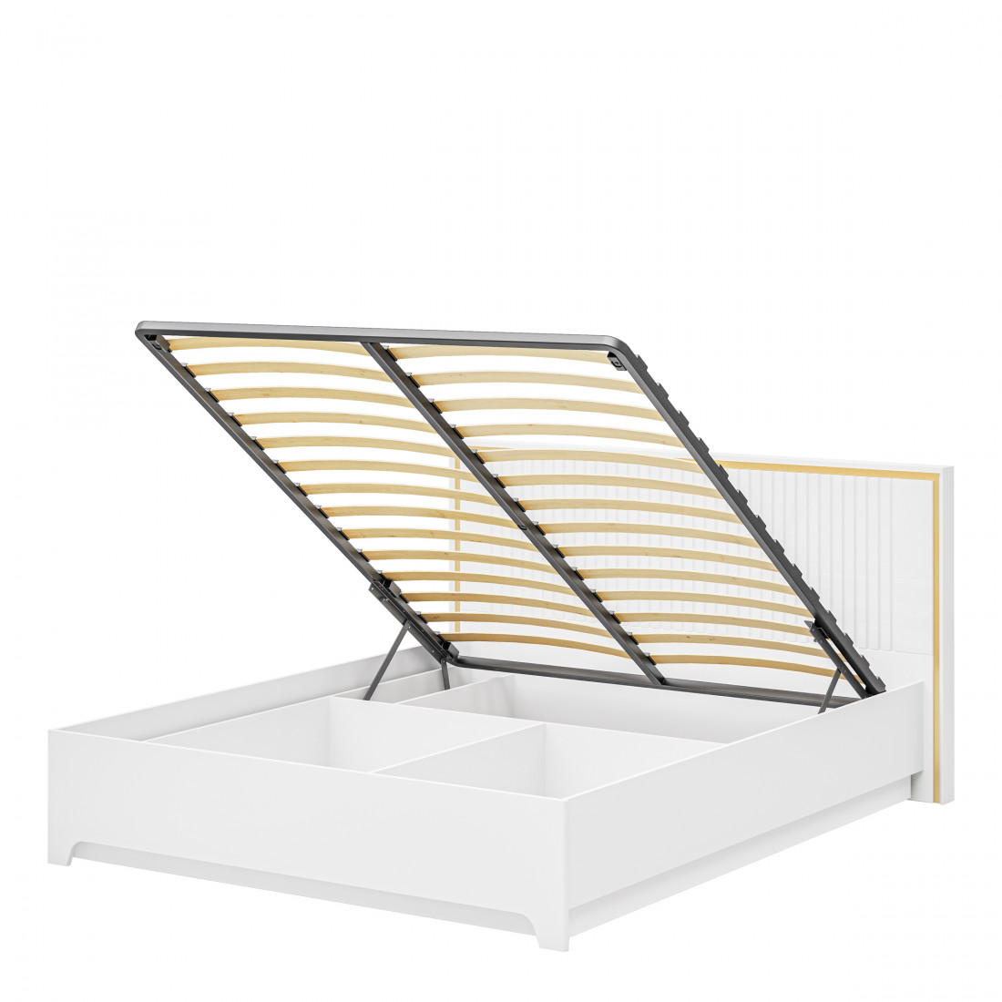 Белоснежная кровать из МДФ в цвете белый глянец. Изголовье кровати украшено золотистой каймой и рефленной фрезеровкой.
