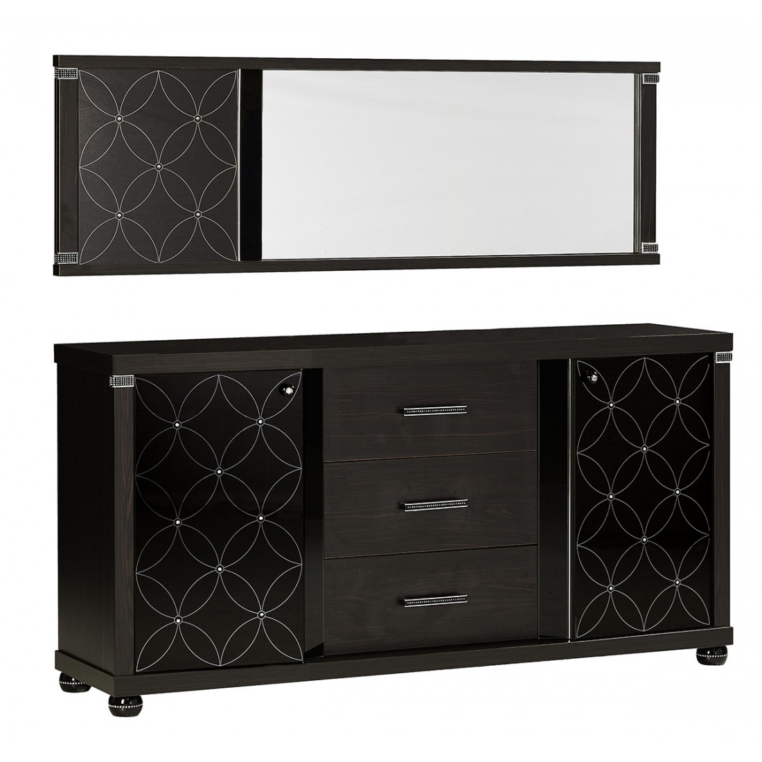 Как и вся другая мебель бренда Bellona, гостиная Мира выполнена из высококачественных материалов и комплектующих. В производстве модульных элементов использовались только экологичные и безопасные материалы: ЛДСП класса Е1, МДФ, нетоксичные клеи, массив, кожзаменитель, каленое стекло. Неповторимости выбранному лаконичному дизайну придают красивые цветы в виде геометрического повторяющегося орнамента, нанесенные на каленое черное стекло. Сердцевины цветов украшены настоящими кристаллами Swarovski. Также кристаллы используются в оформлении декоративных накладок и фурнитуры – необычно круглых ножках и ручках. Данный комплект представлен в цвете венге. В линейке предложений Меланго есть гостиная Мира цвета орех с контрастными черными стеклами в оформлении.