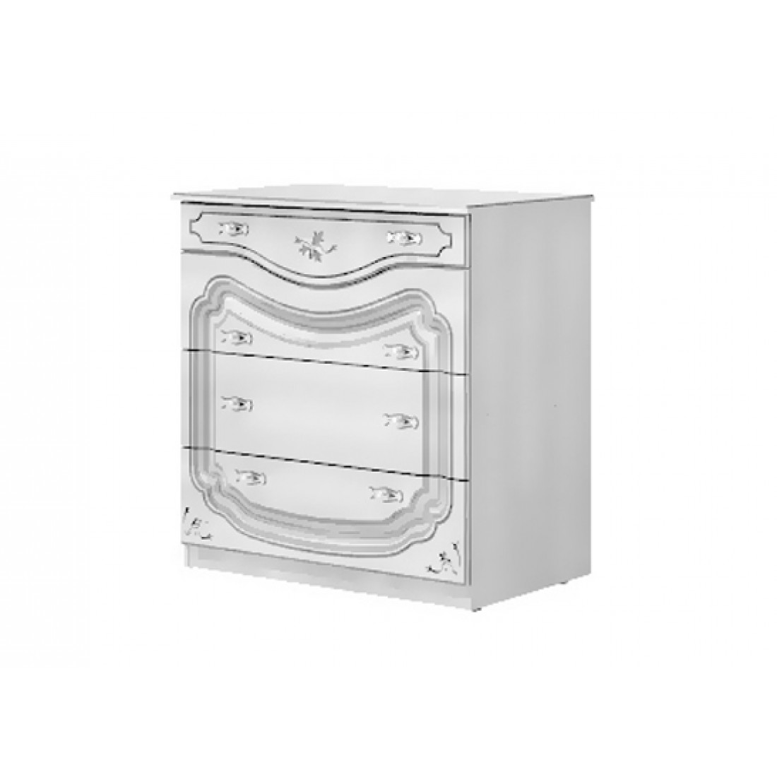 Комод для спальни СП-002-15 серии Орхидея (Мебель-Неман) – незаменимый и предельно практичный элемент любого спального гарнитура. Купить хороший комод с классической, симметричной формы, стильной фрезеровкой на фасадах средних размеров можно в трех расцветках на выбор: элегантно состаренной черешне, дополненной позолотой ольхе или белом глянце.