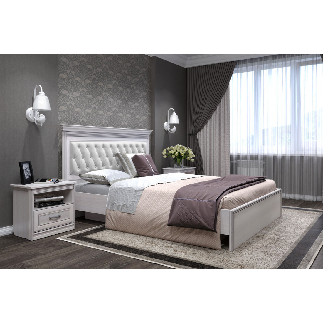 Кровать 1400/1600/1800 с ортопедическим основанием Неаполь Ясень анкор светлый (патина "серебро") экокожа polo белая