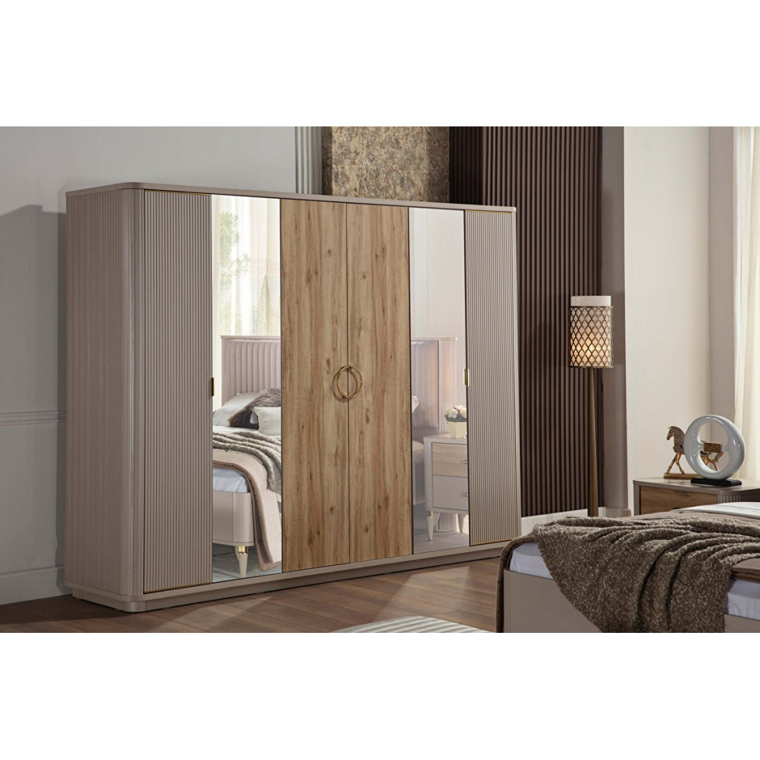 Шестистворчатый  шкаф Санвито SANV-34 длиной 2,710 мм  многофункциональный предмет вашего интерьера для хранения. Фасады шкафа  представлены в комбинации трех видов дверей. По центру выделяется пара дверок из  ЛДСП древесной фактуры с оригинальной круглой металлической ручкой. Рядом расположены зеркала на всю высоту шкафа, и завершают композицию кремовые  фасады с рифленой поверхностью. Углы шкафа имеют скругленные формы.