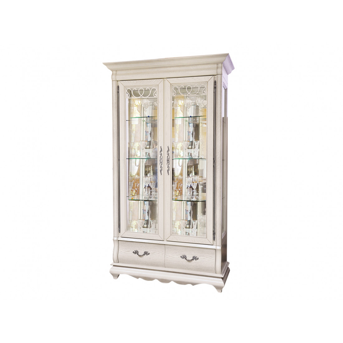 Классический двухдверный шкаф со стеклянными витринами из коллекции мебели "Оскар" это гармония изогнутых форм и стекла. Стеклянные дверцы с фацетом декорированы ажурной резьбой с растительным орнаментом. Фасад выполнен из массива дуба. Модель окрашена в оттенок "Белая эмаль с патиной".