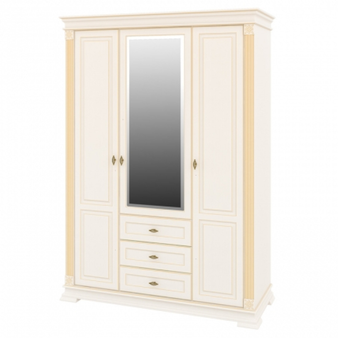 Роскошный трехстворчатый шкаф для одежды и белья МН-222-13 в спальню новой серии Афина (Мебель-Неман) выполнен в светлом кремовом оттенке с золотой патиной, является настоящим подарком производителя. Купить шкаф можно для комплекта полного спального гарнитура Афина с другими элементами серии или отдельно.