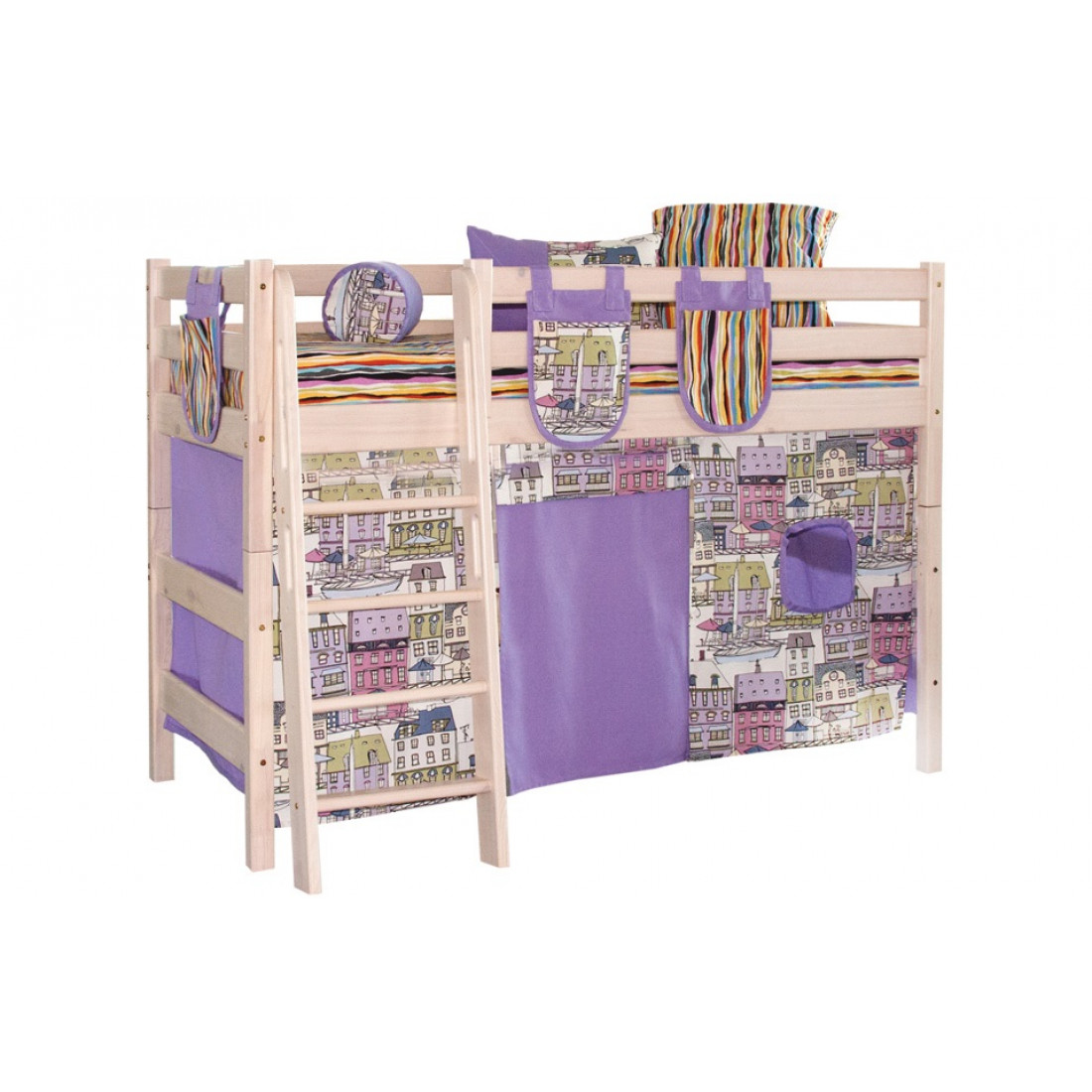 Все кровати «Соня» можно комплектовать аксессуарами из текстиля. Шторы на кровать позволят создать ребенку уютный уголок, где можно как играть, так и хранить игрушки. Покрывало, валик и декоративные подушки создадут в детской единую композицию, а удобные подвесные карманы идеальны для хранения мелочей. Дополнит интерьер комнаты мягкий пуф.