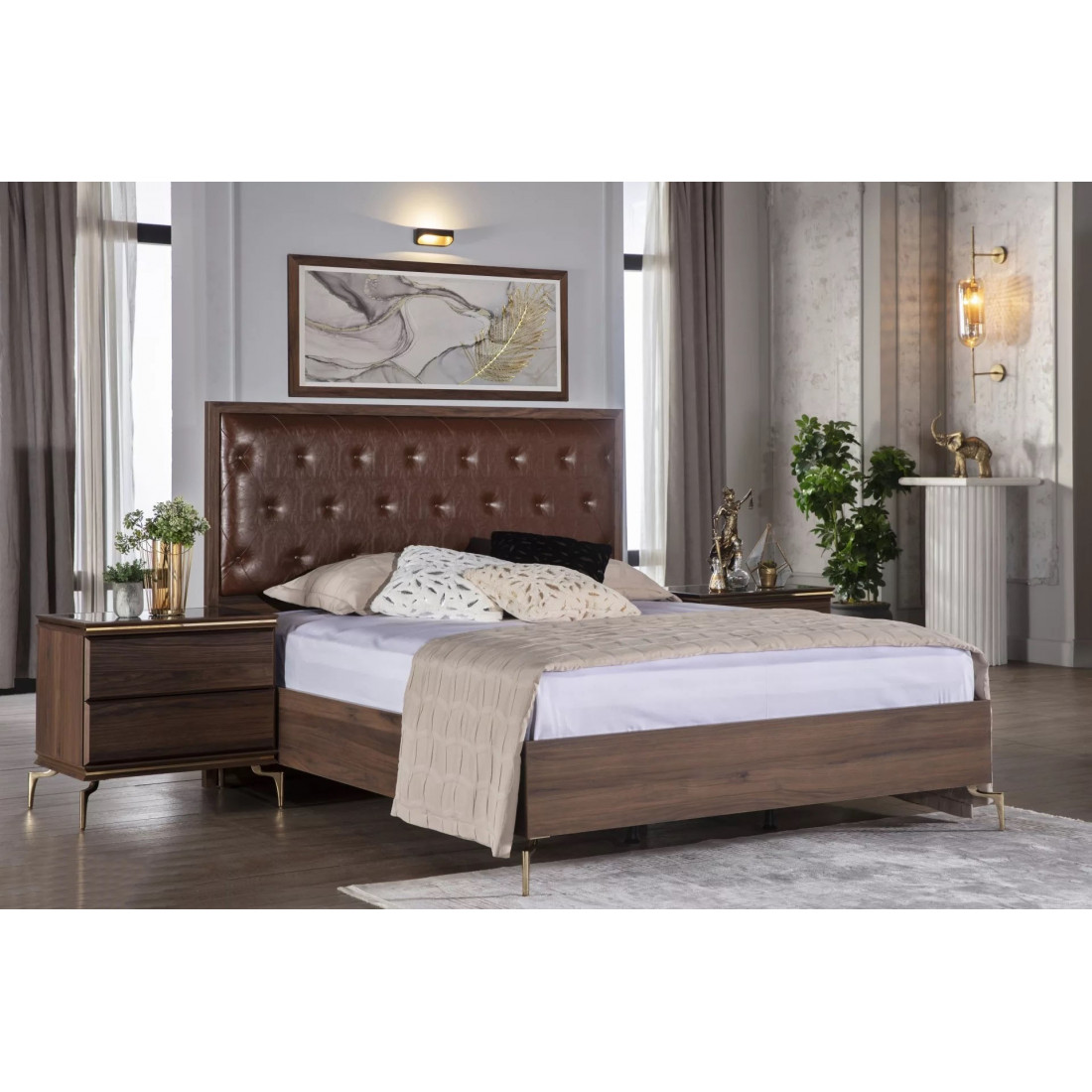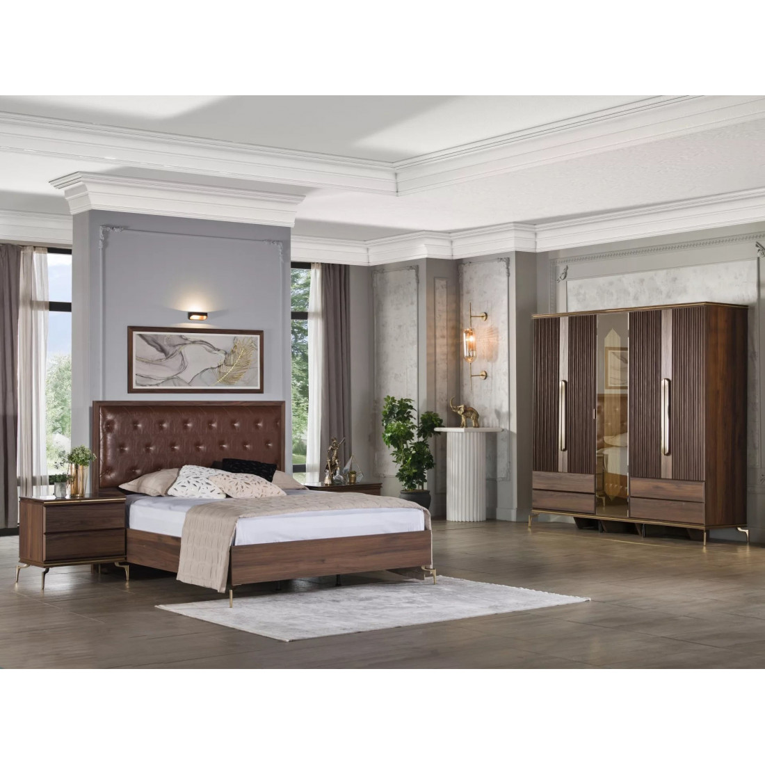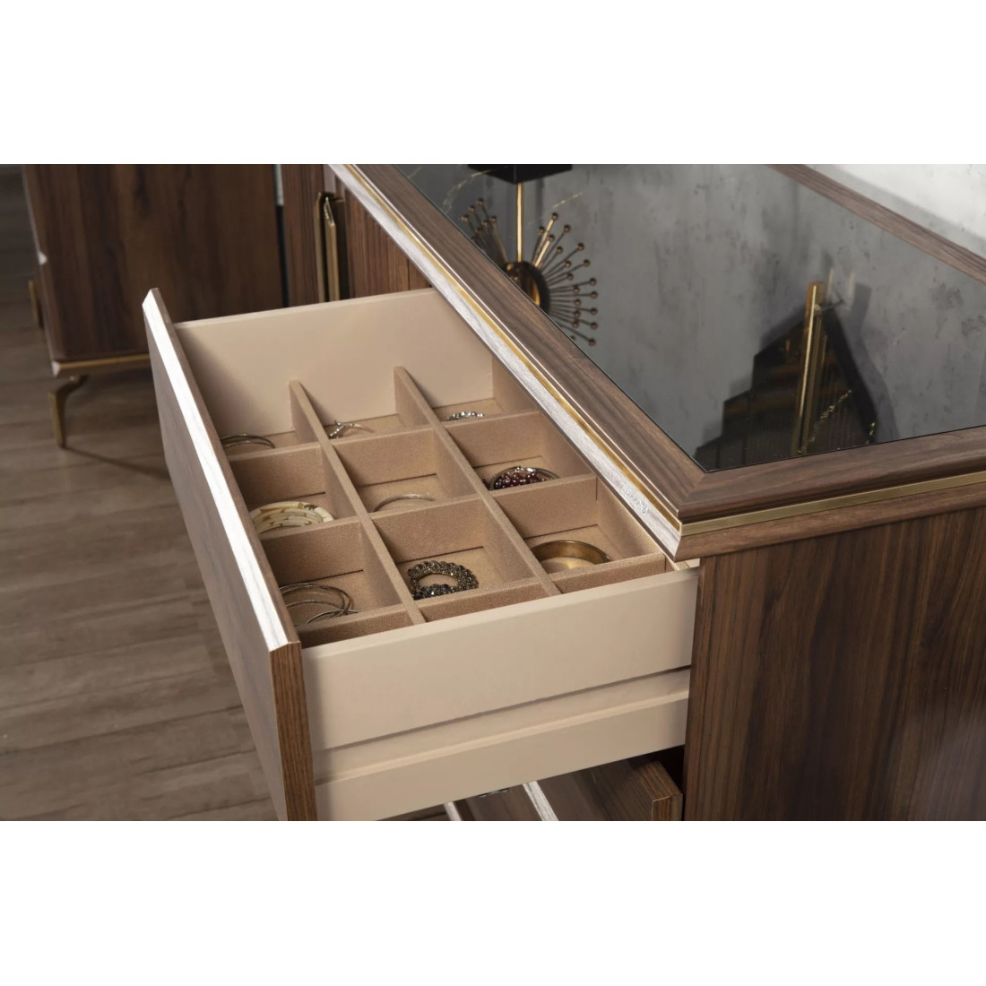 В цветовой конфигурации спальни "Montego" были предпочтительны цвета из черного мрамора с темным орехом. Специально разработанные для коллекции металлические ручки и ножки выполнены в ярко-золотом цвете, чтобы соответствовать стилю. Благодаря применению профиля в треугольной структуре, расположенной по всей системе, было получено визуальное богатство.