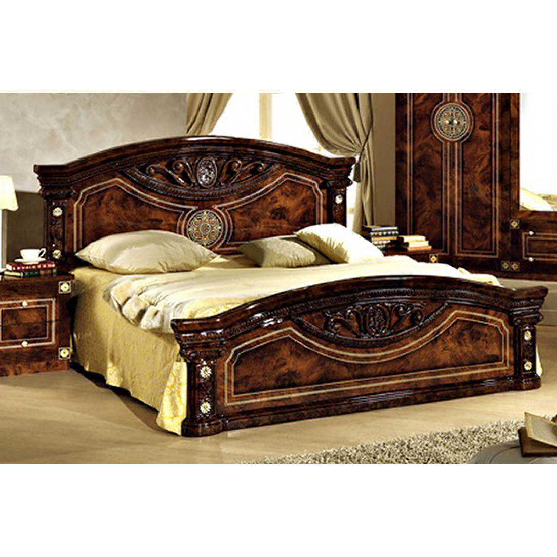 Спальня Рома (орех) от Российской фабрики «ДИА мебель» выполнена в строгом, классическом стиле. Ореховый цвет в сочетании с глянцевым покрытием придает элегантность. Такая спальня поможет Вам окунуться в атмосферу роскоши и комфорта. Безшумные и плавно закрывающиеся дверцы шкафа и комода помогут с легкостью забыть о шуме по утрам. Вся коллекция "Рома" предназначена только для истинных ценителей элегантного классического стиля.