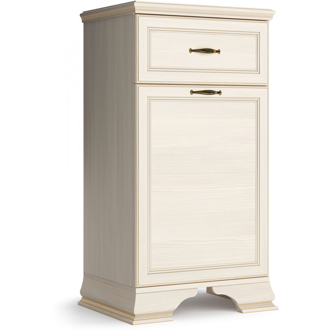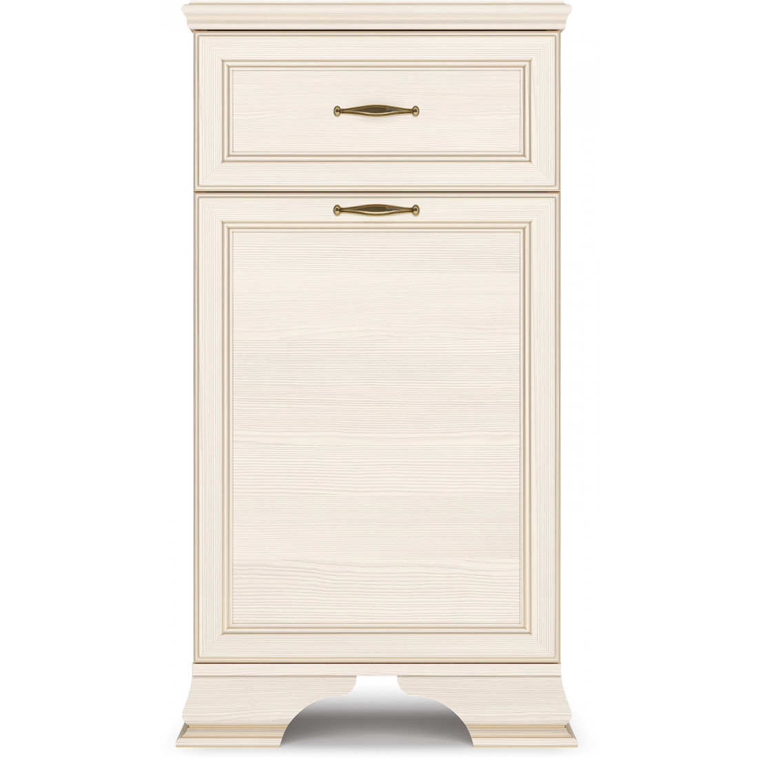 Коллекция производится в текстуре «бодега белый» с эффектом золотого патинирования. Облик «Сиены» дополняют рамочные фасады и карниз в классическом стиле, а также эффектные опоры из МДФ. Мебель комплектуются металлической лицевой фурнитурой премиум-класса в цвете «старая бронза» и надежной крепежной фурнитурой.