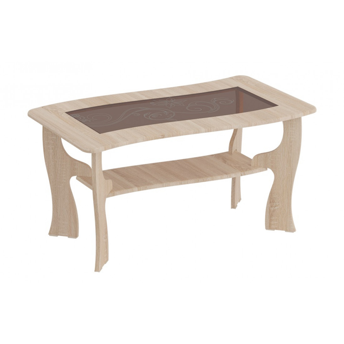 Широкий прямоугольный журнальный столик в гостиную от фабрики МебельГрад со стеклянной столешницей подойдет для оформления современного или классического интерьера. Стекло столешницы тонированное, декорировано пескоструйным рисунком. Модель представлена в двух цветах - Венге Мали или Дуб Сонома на выбор.